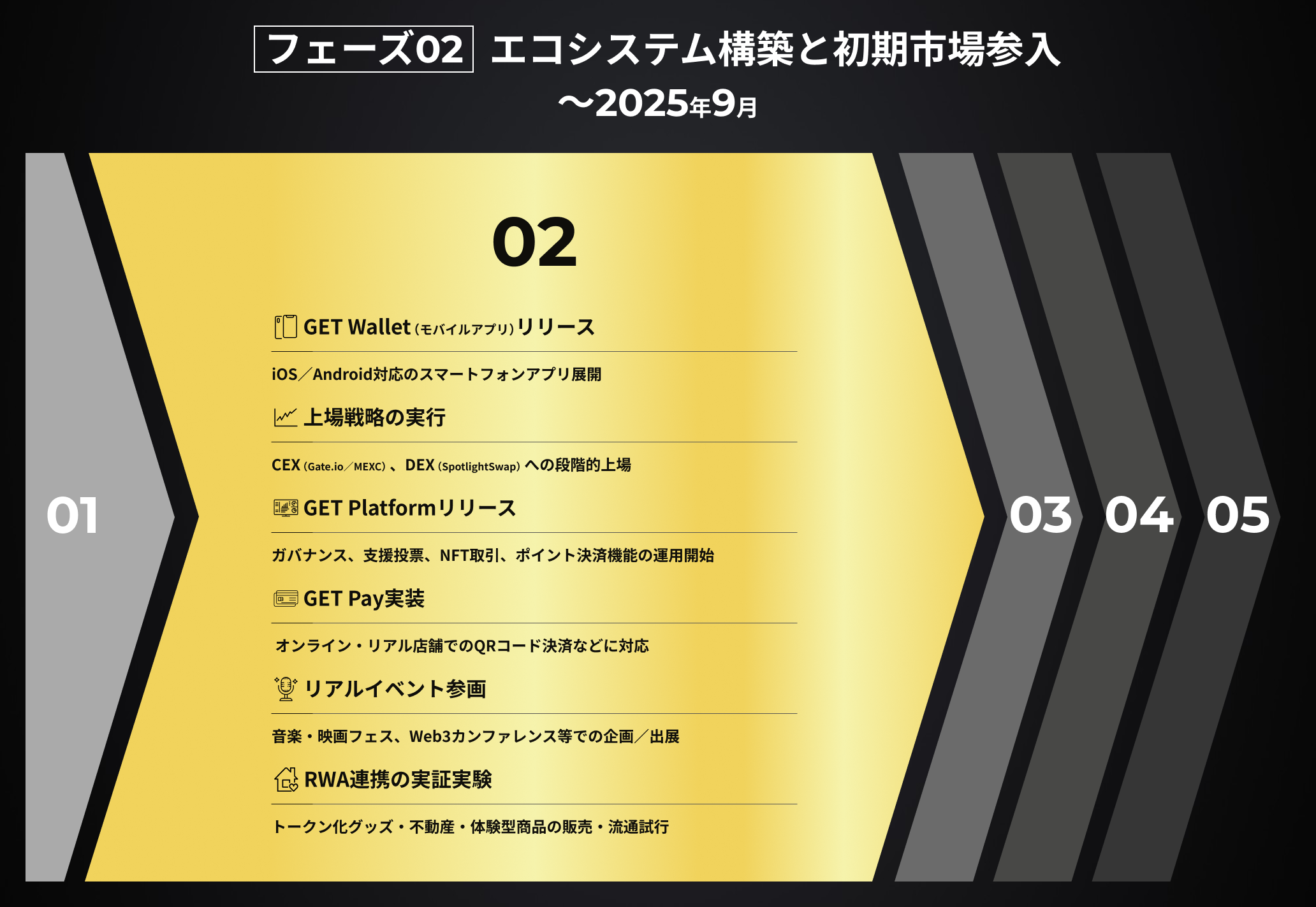 この段階では、GET Platformの正式公開を含む、NFT・RWA流通市場の初期形成を目指します。